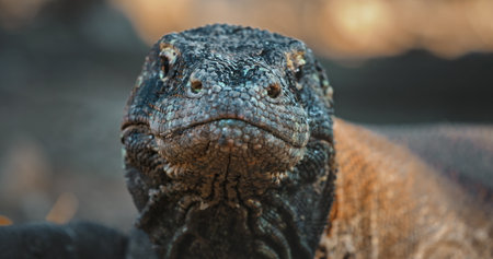Komodo dragon staring intensely, its rough, scaly skin and powerful jaws on full display, creating a captivating and slightly intimidating portrait of wildlife