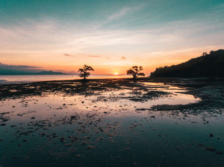 Beautifull sunset with mangrove three in low tide beach at Ai Lemak Beach, Sumbawa, Indonesia