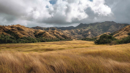 Breathtaking view of rolling hills adorned with golden grass, accompanied by dramatic clouds in the sky highlighting nature's beauty and peace.