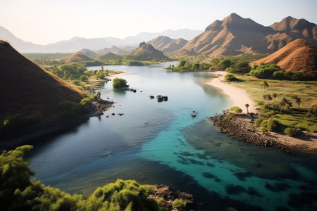 Generative AI : Aerial view of a black sandy shoreline on Komodo Island Komodo National Park Indonesia