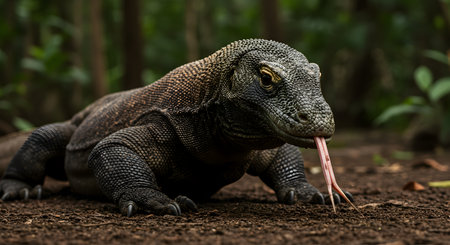 A stunning Komodo dragon curiously exploring a sunlit forest, showcasing its unique textures, vibrant colors, and natural habitat in Indonesias rich ecosystem, Komodo Island, Indonesia