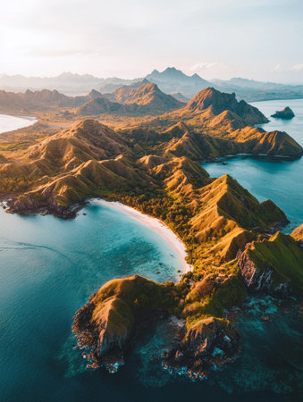 Tranquil island vista comical shape, lush hills, sandy beaches, viewed from dawn lit mountain peak