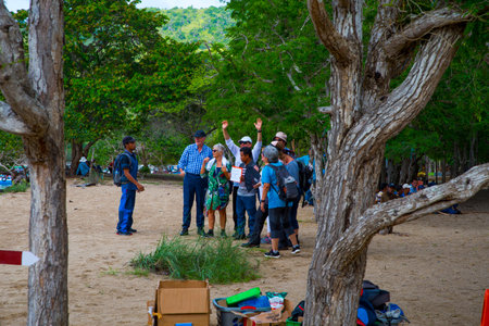 Rinca Island, Indonesia - January 10, 2019: Komodo dragons and Ranger of Komodo National Park. The Komodo dragon, scientific name: Varanus komodoensis. Natural habitat. Indonesia. Rinca Island.