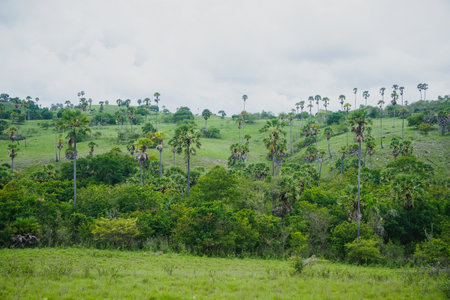 Sunset sky, green grassland. Panorama. Sumba, Indonesia. Magnificent scene the meadow on the colorful sunset sky background. The beauty of Sumba island, Indonesia. Idyllic place for relax.