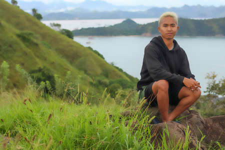 Portrait of young man on the top of hill wearing black jacket with the sea background in Labuan Bajo