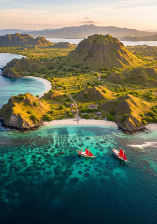 Komodo island in Indonesia, where dramatic volcanic terrain and crystal-clear beaches merge with unique wildlife to spark an adventurous journey into nature.
