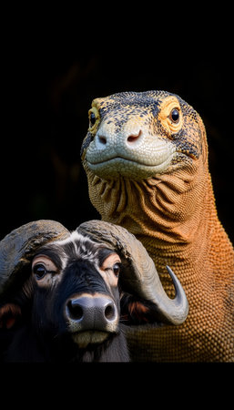 Komodo Dragon and Water Buffalo A Portrait of Wildlife Contrast on Black, 85 Characters