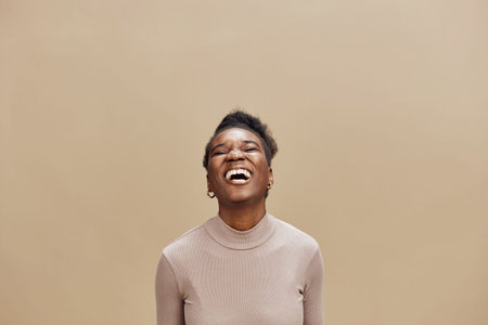 Joyful black woman laughing against a beige background, conveying happiness and positivity through her vibrant expression and relaxed style