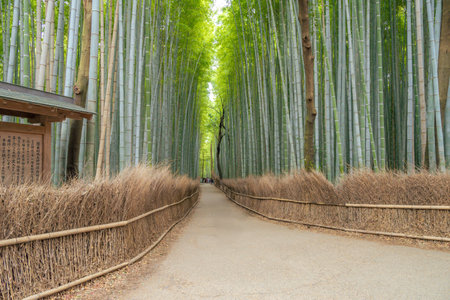The view of Arashiyama Bamboo Forest aka Arashiyaman Bamboo Grove in Kyoto, Japan. One of Japan's most famous tourist attraction. Bamboo landscape. Travel and nature concept.
