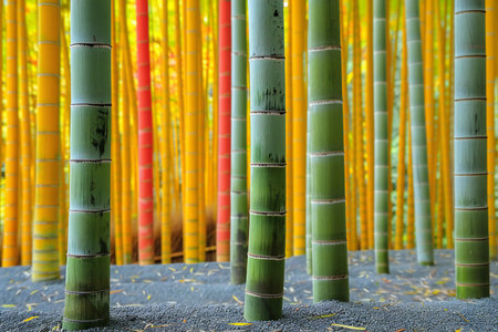 Bamboo forest grove with tall trunks and lush green nature, dense vertical stems creating a serene woodland scene with textured pattern and soft sunlight filtering through.