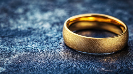 This image features a beautifully crafted gold wedding band resting on a textured surface, symbolizing commitment and love. Perfect for romantic themes.