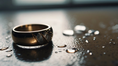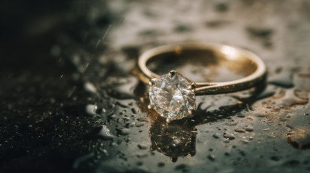 A stunning gold ring featuring a brilliant diamond rests on a wet surface, capturing soft light and creating an atmosphere of luxury and elegance.