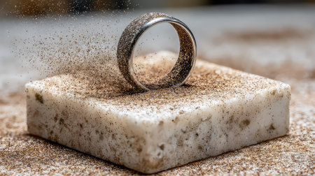 A stunning silver ring elegantly placed on a textured surface, surrounded by delicate specks of golden sand, capturing a serene and artistic moment.
