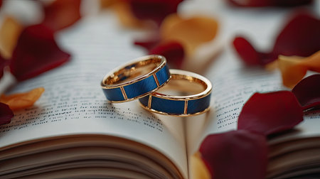 This captivating image showcases two elegant wedding rings with striking blue accents placed on an open book, surrounded by colorful rose petals, evoking romance and love.