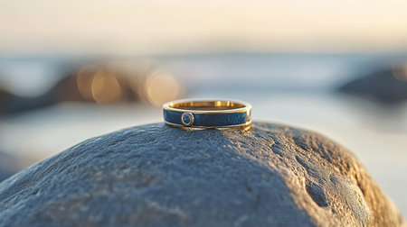 A stunning gold ring with a blue band sits gracefully on a smooth rock near the ocean, capturing the warmth of a sunset in a serene landscape.