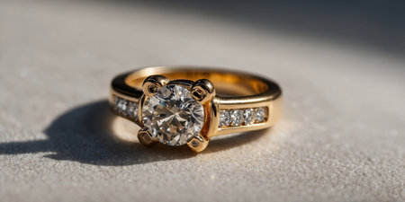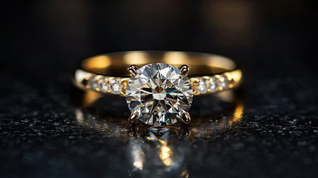 A stunning diamond ring gleams on a smooth marble surface, showcasing its sparkle and reflection. This elegant image captures luxury and romance perfectly.