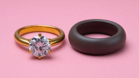 Stunning gold engagement ring featuring a brilliant diamond paired with a sleek dark wedding band, ideal for representing love and commitment against a soft pink backdrop.