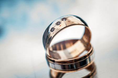 beautiful golden wedding rings on sparkling background