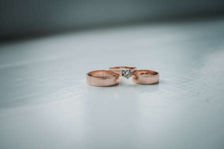 elite wedding engagement rings made of gold, unique original design, beautiful official wedding decoration.