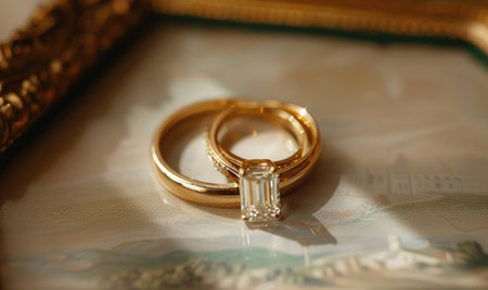 Close-up of elegant wedding rings resting on a sparkling golden background, showcasing a romantic and luxurious atmosphere perfect for celebration and love.