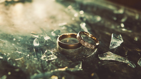 Two wedding rings rest on a surface surrounded by broken glass shards. the scene evokes themes of love, fragility, and resilience, contrasting the delicate jewelry with the sharp, reflective pieces of glass.