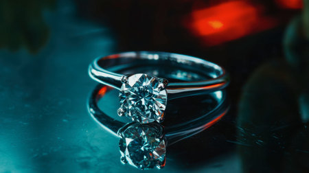 Stunning diamond ring showcased on a reflective surface, featuring vibrant colors in the background. The piece radiates elegance and luxury.