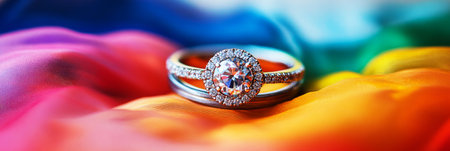 A close-up of wedding rings on a rainbow flag, signifying lifelong commitment, love, and equality, reflecting the LGBTQ community's struggle for recognition and the power of diversity, banner