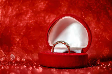 Two engagement rings and red heart-shaped velvet box on background with bokeh lights and flowers. Valentine background. Presents for woman on Valentine's Day. Love, proposal concept.
