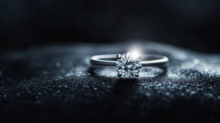 A close-up view of an elegant diamond ring resting on a textured stone surface. The soft light enhances the ring's clarity and sparkle, creating a romantic atmosphere.