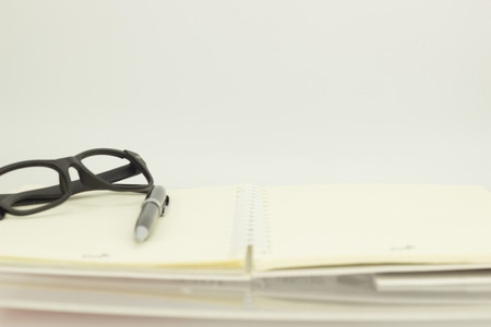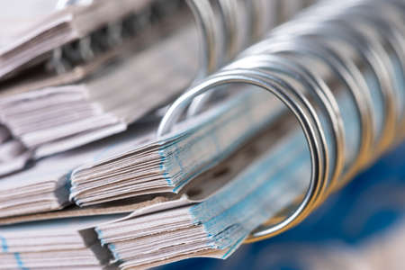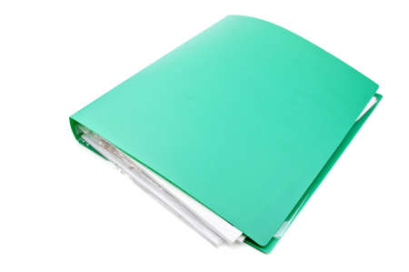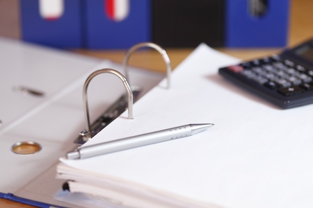 Part of an open ring binder with many documents on a stack of more file folders, business and office concept fading to a white background, copy space, selected focus, narrow depth of field