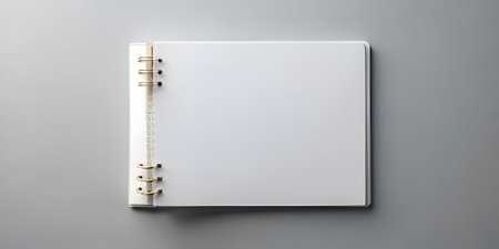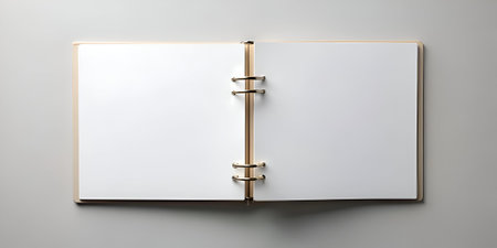 Clean and minimalist mockup of an open binder with blank white pages. Perfect for showcasing your designs. branding. or showcasing handwritten notes and ideas.