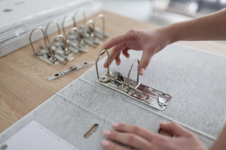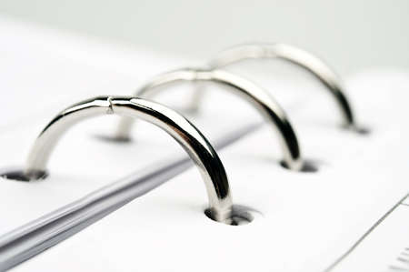 Open yellow binder close up , stack of white papers and bright metal rings , in the background black text out of focus
