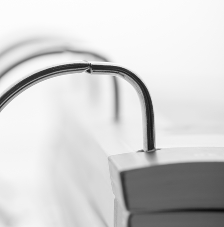 File binder fastener with pile of papers clipped inside it closeup. View some information in catalog list