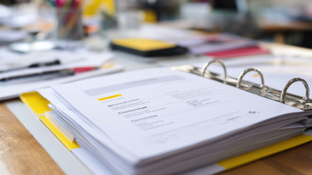 A close-up view of neatly organized documents in a binder on a desk, surrounded by various office supplies, reflecting a busy and efficient workspace atmosphere.