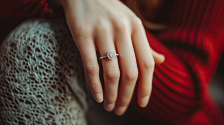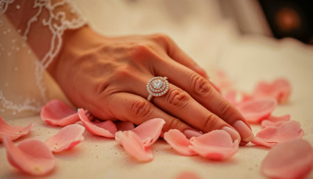 Woman's hand with a diamond ring on her ring finger, captured for advertising and business wallpapers