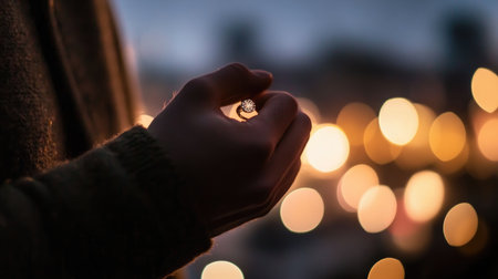 A man holding an engagement ring, preparing to propose, with blurred city lights in the background.