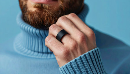 Bearded man wearing black smart ring on finger symbolizing modern wearable technology and minimalist fashion trend.