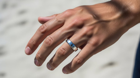 Wedding ring on the hand of a man on the beach
