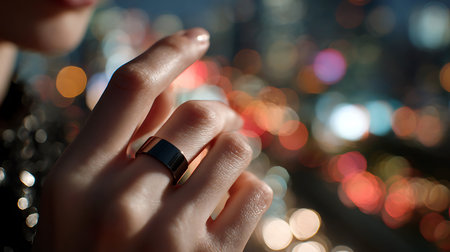 Futuristic glowing smart ring on finger highlights wearable tech blending style innovation and subtle biometric data monitoring.