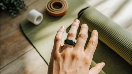 A smart ring resting on a hand designed with minimalist aesthetics and health tracking capabilities as a yoga mat and meditation props are softly seen in the background..