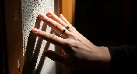 A close-up of a hand gently touching a textured wall illuminated by a sharp beam of sunlight and shadow. The image focuses on sensory experience, detail, and the interplay of light and surface.