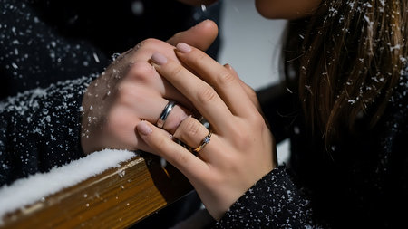 Holding hands with wedding rings in focus and subtle sparkles in background, romantic tone