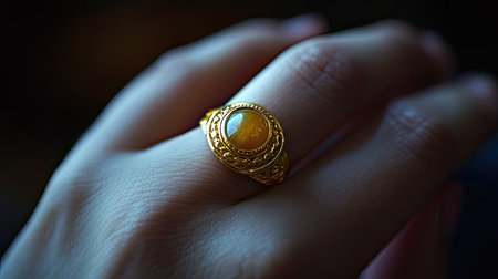 An elegant gold natural stone ring on a female model's finger, framed with artistic lighting for professional jewelry photography.