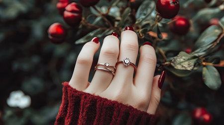 A close-up view of a hand adorned with rings, set against a backdrop of vibrant red berries and lush green leaves, showcasing elegance and natural beauty.