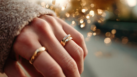 Romantic close-up of couple holding hands under soft string lights, rings glowing subtly