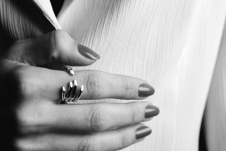 woman finger ring on grey background