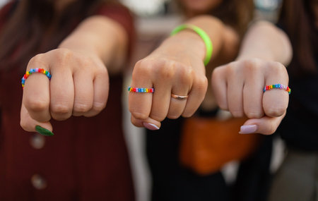 close-up view of a mans hand showing a ring with an LGBT rainbow wristband.