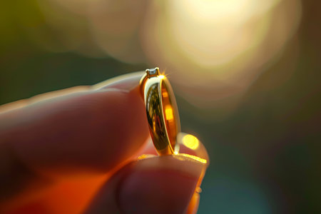 A woman's hand delicately holds a simple gold wedding ring, featuring a small diamond, against a blurred green background. Sunlight illuminates the ring, creating a warm glow.