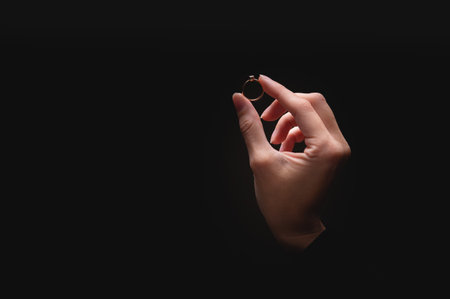Close-up of a womans hands with an elegant diamond ring on a black background. A diamond ring is given out of the darkness by a womans hand