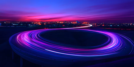 Cars and trucks navigating a complex highway interchange at dusk create a captivating display of lights and movement, highlighting the intricate patterns of urban transportation